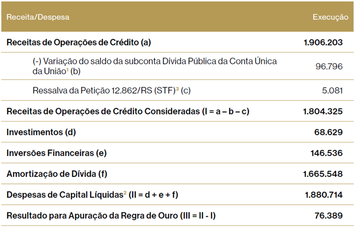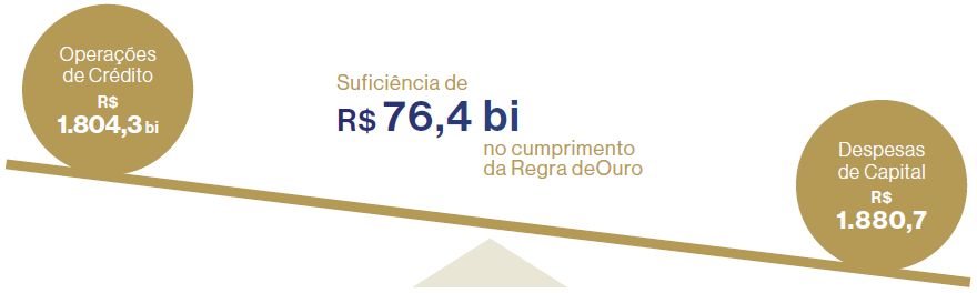 No exercício de 2024, a União cumpriu a Regra de Ouro tanto na peça orçamentária quanto ao final do exercício. A regra foi cumprida com uma margem de suficiência de R$ 76,4 bilhões, resultado da diferença entre as despesas de capital executadas (R$ 1,88 trilhão) e as receitas de operações de crédito consideradas (R$ 1,80 trilhão).