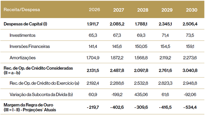 No que diz respeito às projeções de médio prazo, a STN projetou montantes preocupantes para a Regra de Ouro, com possibilidade de insuficiência já a partir de 2026.