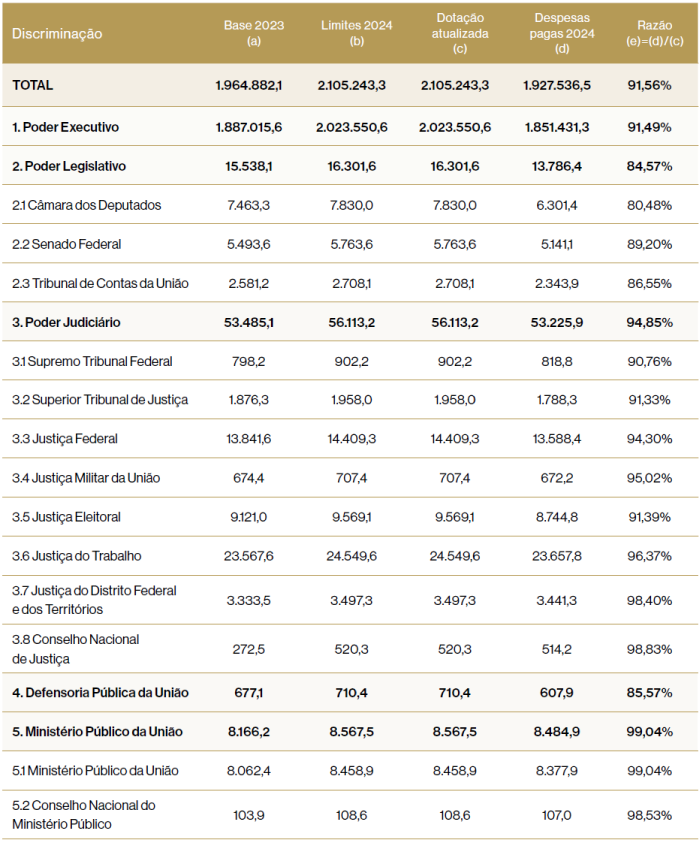 Em conformidade com os dados oficiais da Secretaria do Tesouro Nacional, validados por este Tribunal, o limite de despesas primárias para o ano de 2024 foi fixado em R$ 2.105.243,3 milhões. Esse limite foi respeitado, pois as dotações orçamentárias não excederam o valor estipulado. Além disso, a análise dos dados evidencia que todos os órgãos e poderes respeitaram o limite estipulado para cada órgão ou Poder, conforme determinado pelo artigo 3º da Lei Complementar 200/2023.