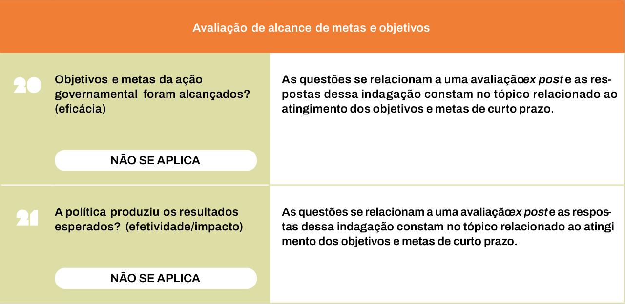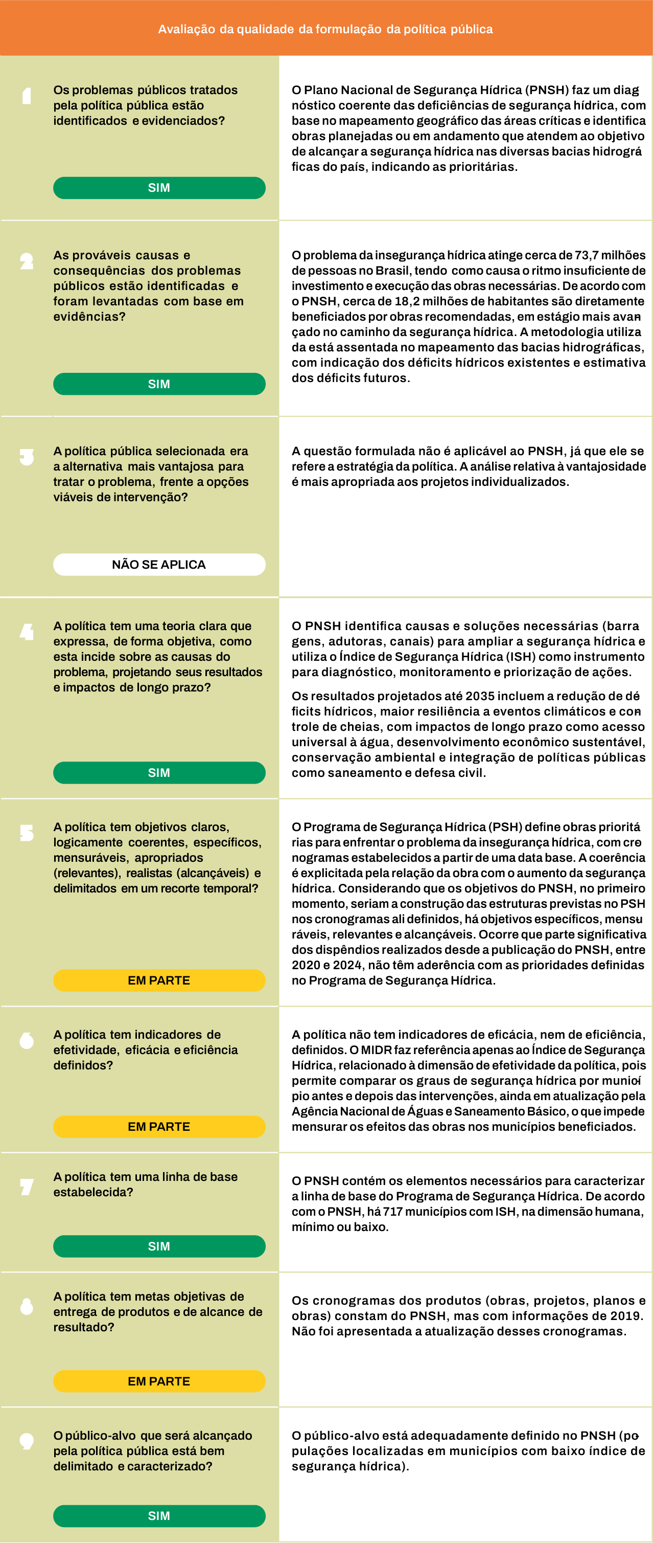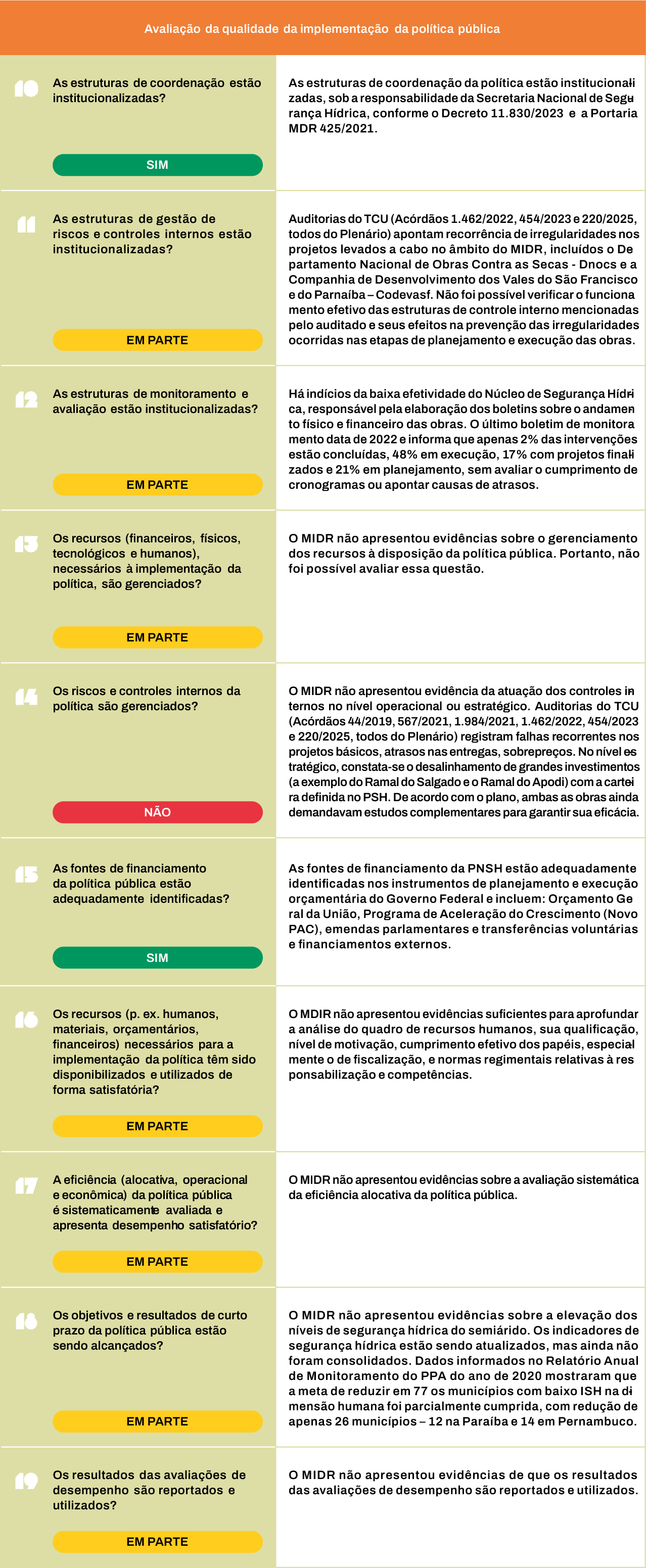 O quadro-resumo a seguir detalha a avaliação do TCU sobre o atendimento (sim, em parte, não e não se aplica) a questões relacionadas a qualidade da formulação, implementação e avaliação de políticas públicas.