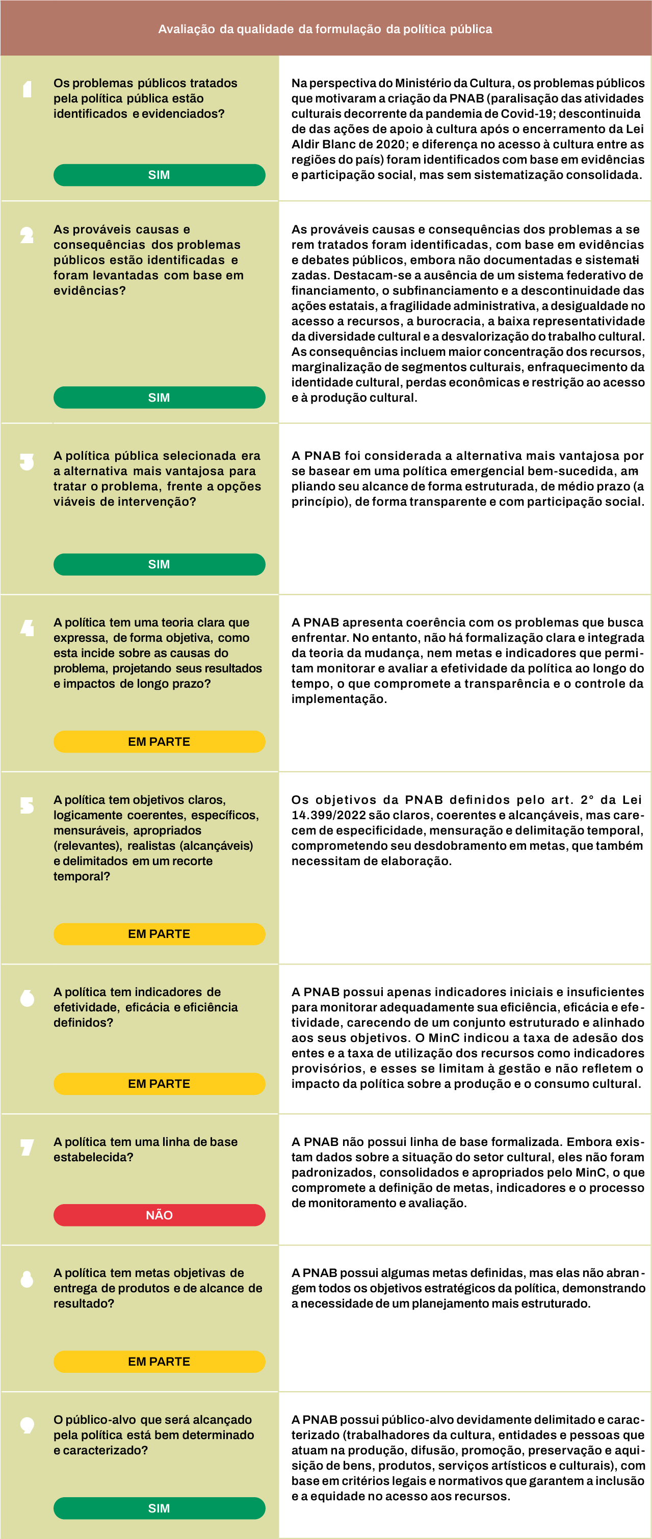 A formulação da PNAB possui alinhamento com os problemas do setor cultural, como o subfinanciamento, a concentração regional de recursos e a baixa capacidade operacional de entes federativos. Porém, esse alinhamento não está expresso em modelo lógico que induza a apropriação estratégica da política por parte dos gestores. Além disso, a PNAB carece de metas, indicadores e linha de base, comprometendo a orientação a resultados.