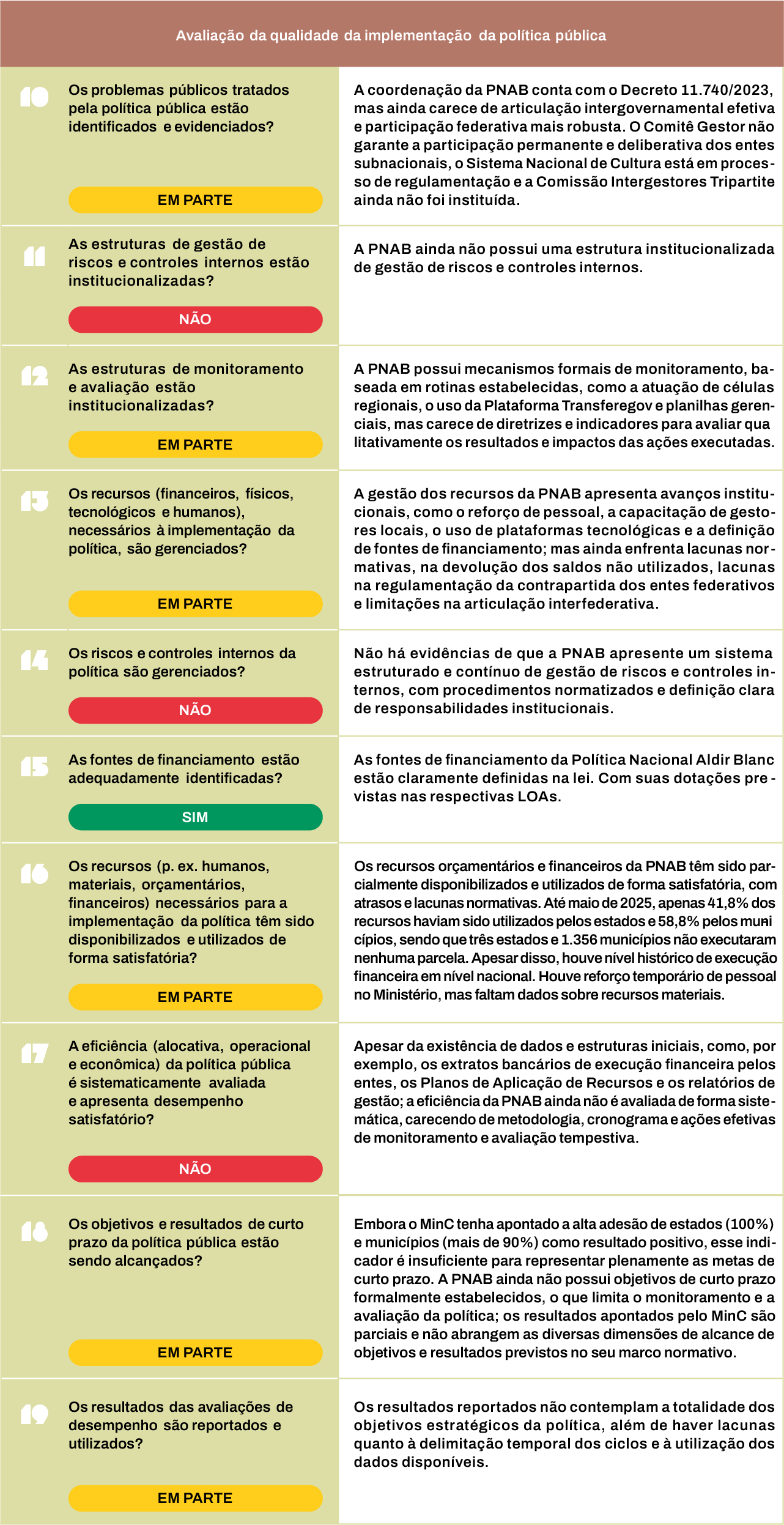 Com relação à implementação, a política conta com fontes de recursos bem identificadas, contribuindo para a regularidade do seu financiamento. A PNAB também prevê consultas à sociedade civil e outros instrumentos de participação social. O MinC tem se esforçado para estruturar e operacionalizar a política, incluindo a criação de Comitê Gestor, a contratação de equipe temporária de apoio e a oferta de orientações técnicas aos entes federativos. Contudo, foram identificadas fragilidades na coordenação interfederativa, na regulamentação de etapas operacionais relevantes – como os procedimentos para devolução de saldos não utilizados – e sobretudo na gestão de riscos, que carece de estruturas e processos definidos. Também foram averiguadas oportunidades de melhoria nas práticas e ferramentas de transparência.