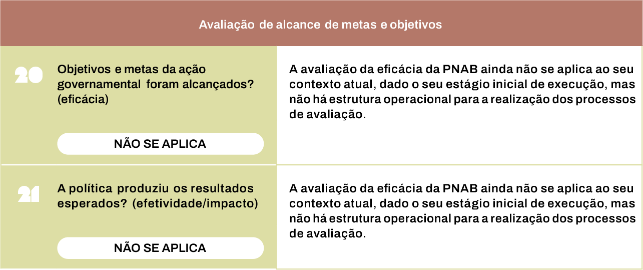 Finalmente, no que concerne à avaliação, constatou-se que as estruturas e processos de monitoramento e avaliação são incipientes, e que, mesmo a política sendo recente, o MinC já detém dados que permitem iniciar a implementação dessa etapa. Contribui para a fragilidade do monitoramento e da avaliação da PNAB a já citada falta de metas e indicadores.