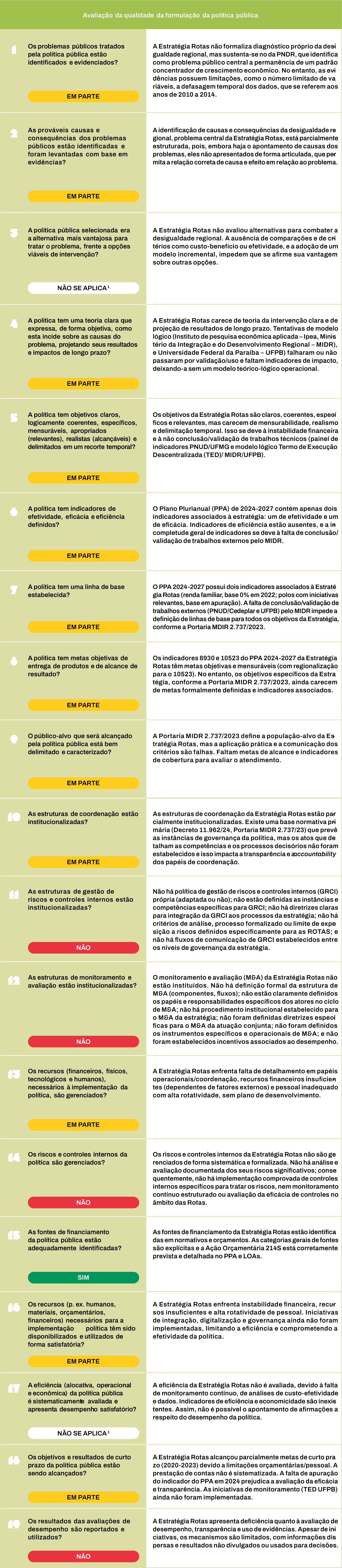 O quadro-resumo a seguir detalha a avaliação do TCU sobre o atendimento (sim, em parte, não e não se aplica) a questões relacionadas a qualidade da formulação, implementação e avaliação de políticas públicas.