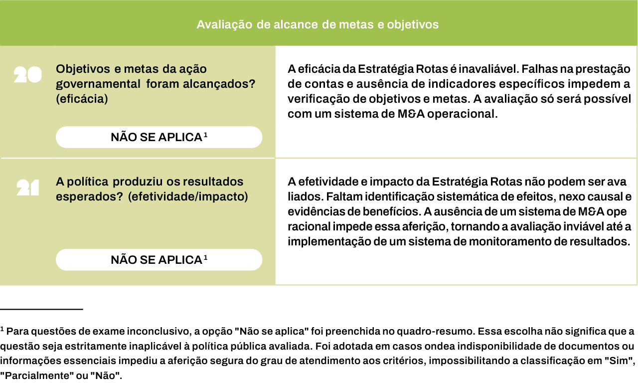 - A Estratégia Rotas também não possui um sistema de monitoramento e avaliação (M&A) estabelecido e operacionalizado, o que impede a avaliação sistemática de seus resultados, inviabiliza a aferição da eficácia e efetividade da política e inviabiliza a prestação de contas e disponibilidade de informações públicas consolidadas. Essa lacuna compromete a tomada de decisão, limita a melhoria contínua e fragiliza a transparência e o accountability da intervenção pública.